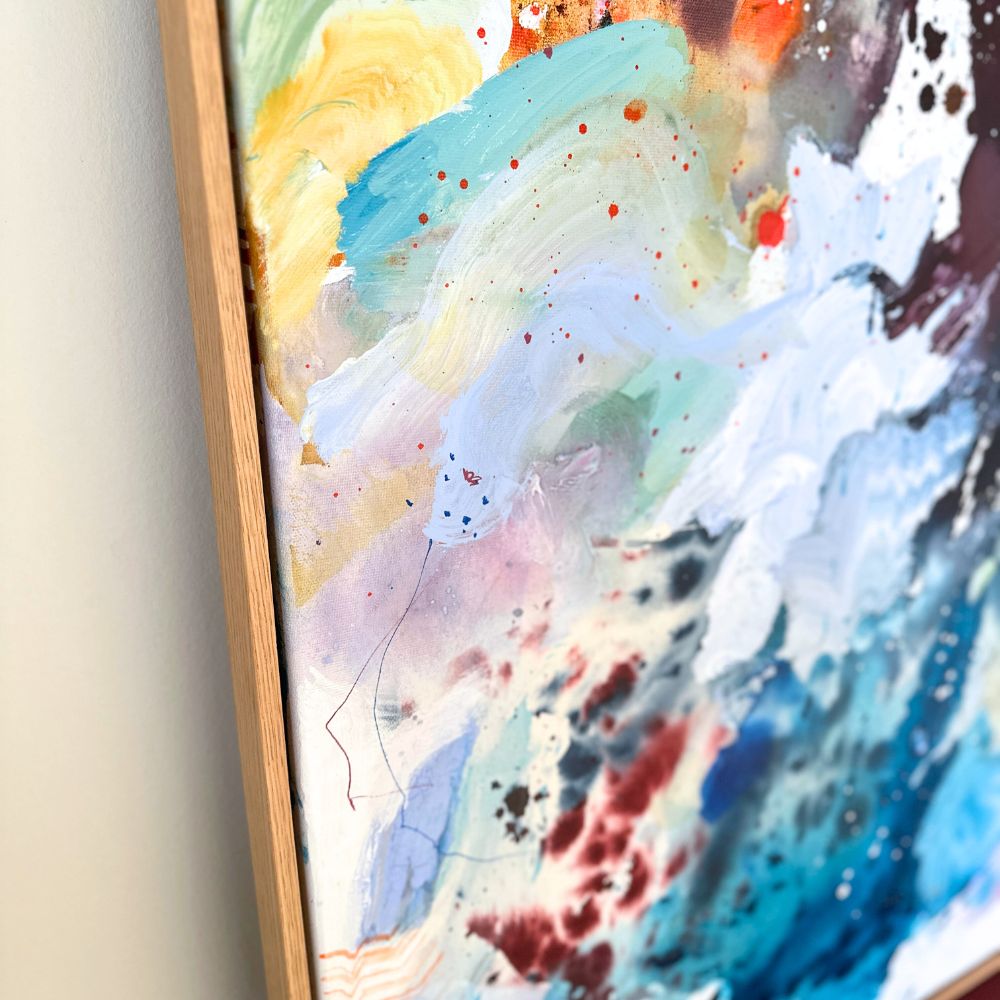 When standing in front of the painting, you will notice how the color combinations, textures, and the mix of opaque and abstract layers create their own unique, colorful narratives that you will never truly finish exploring.