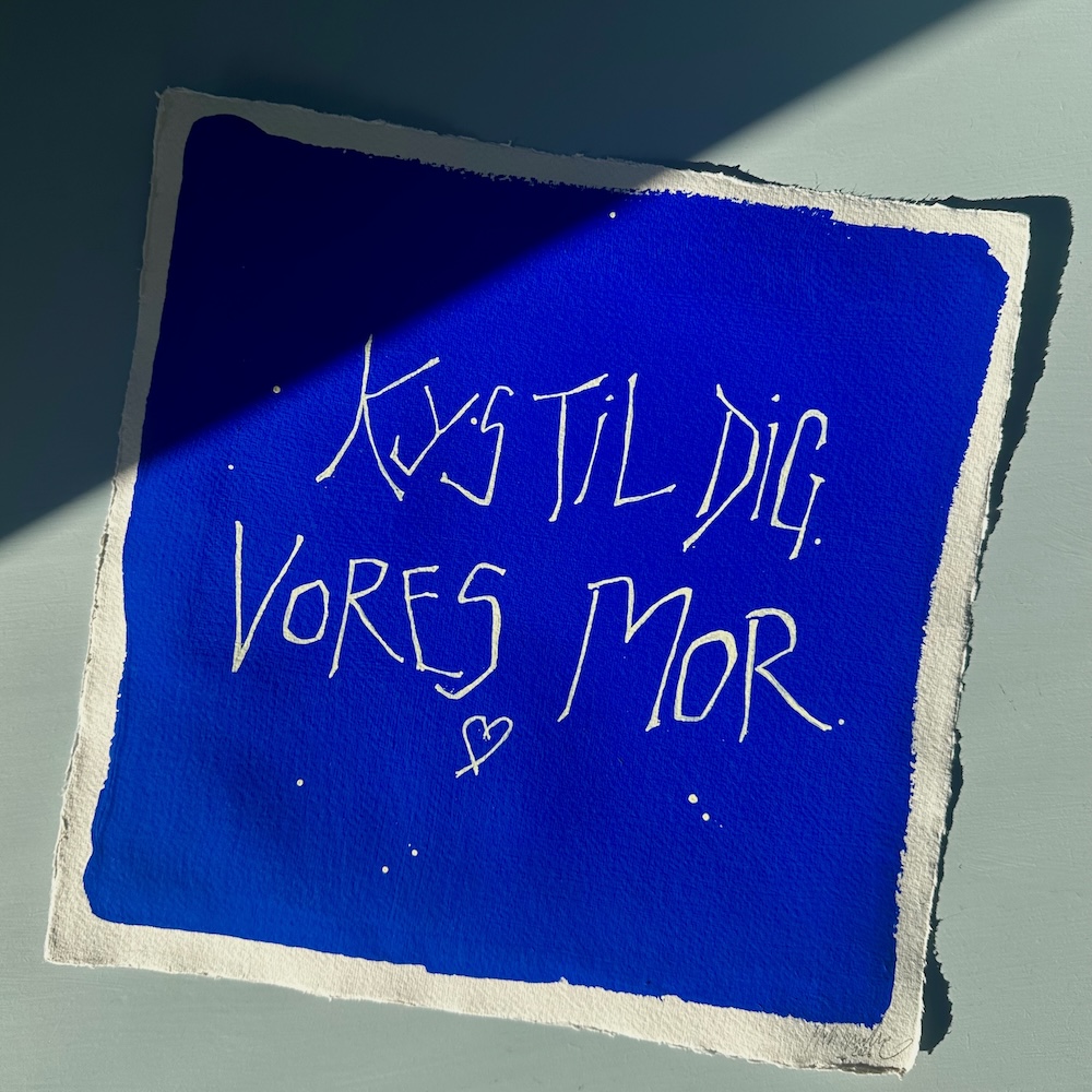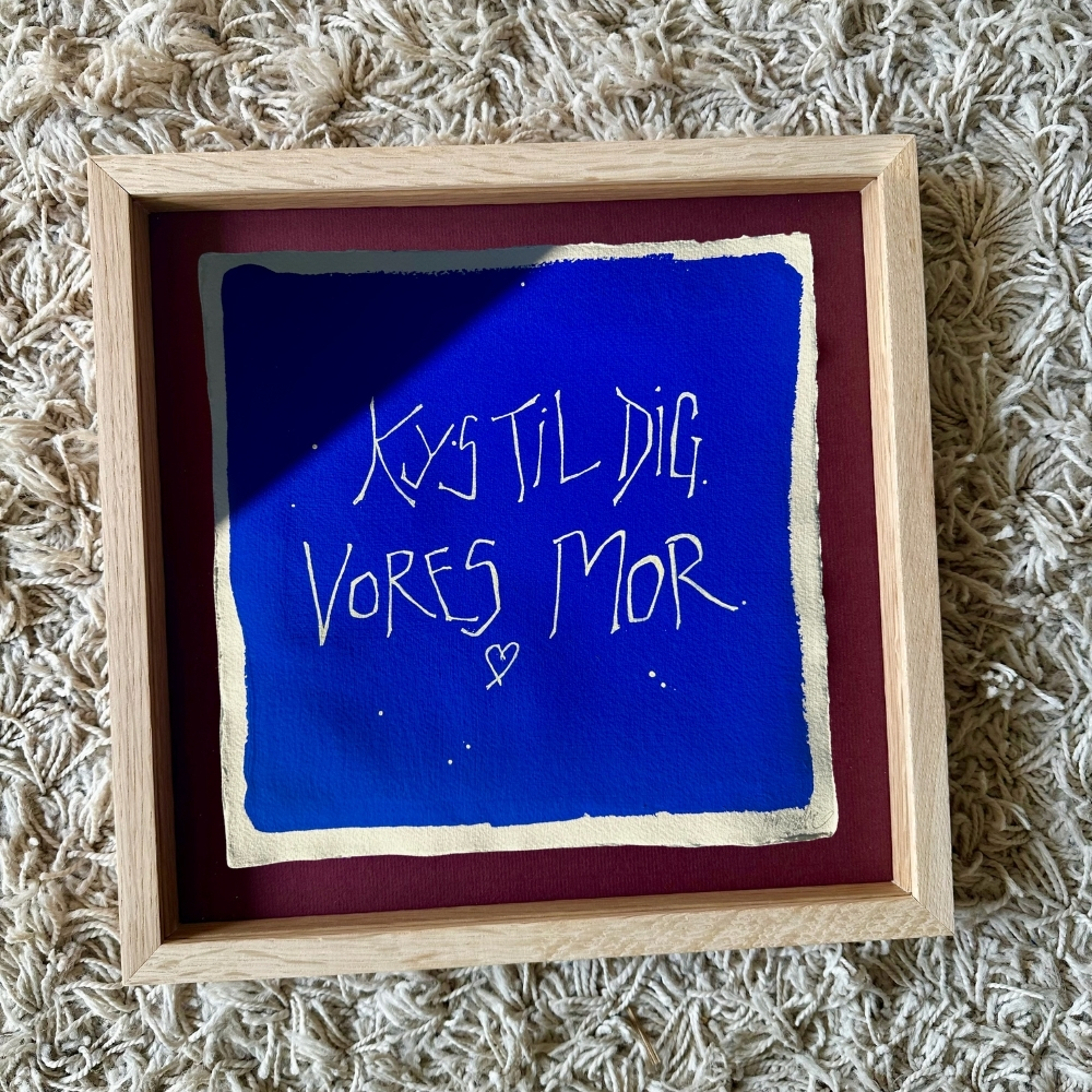 Giv værket til en mor, du holder af. Måske dig selv? Jeg forestiller mig, at det kan hænge ved natbordet – eller måske på en væg i en solstråle hos den mor, som du synes skal ha’ et kunst-kys.