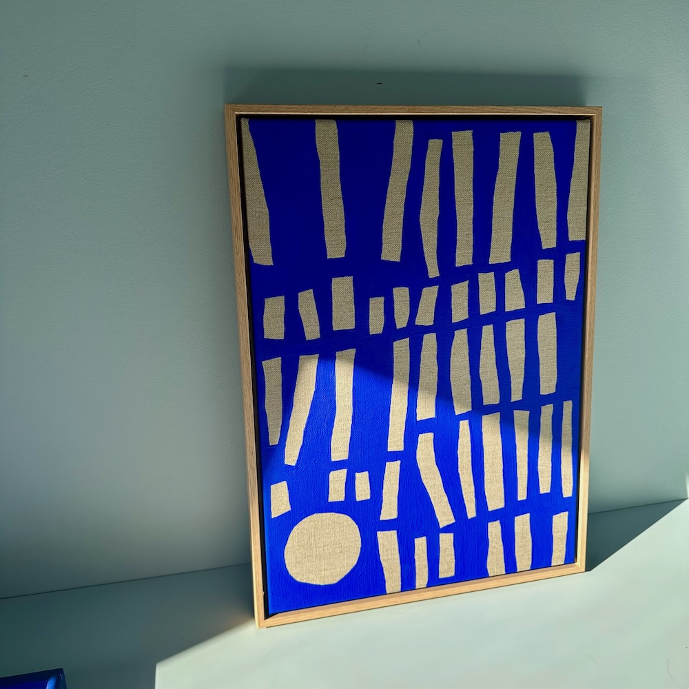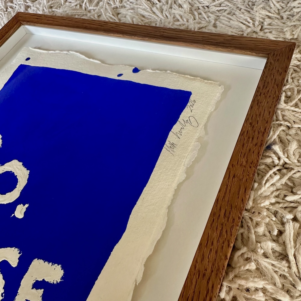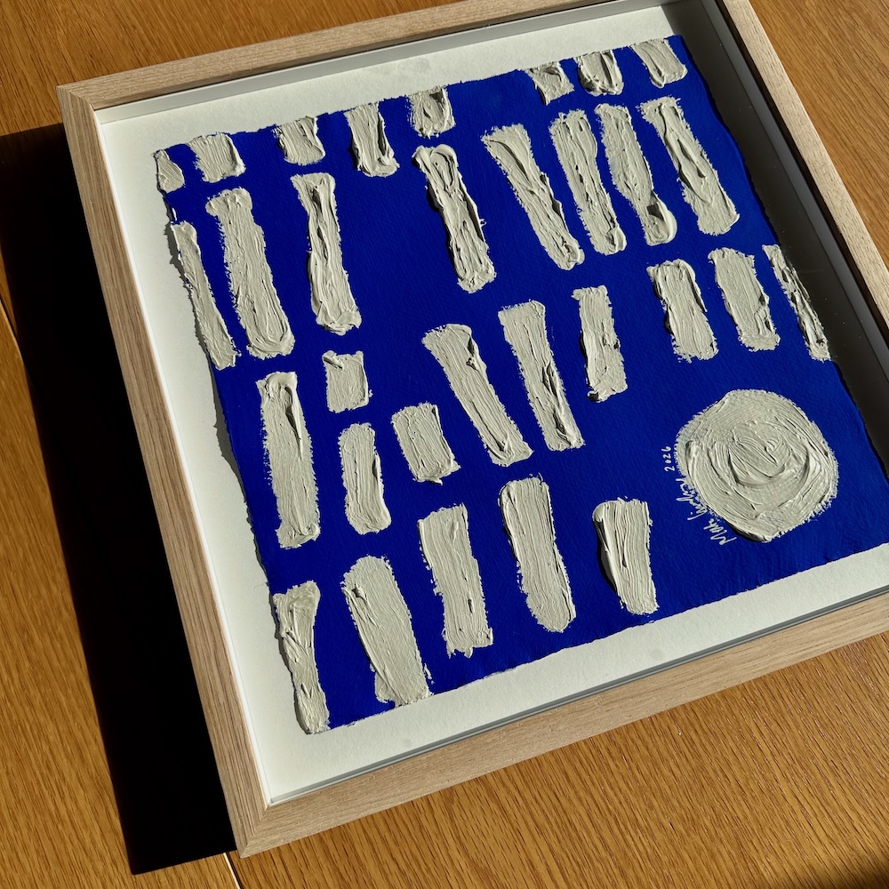Ordene er mine egne. Og de er håndskrevet af mig – oven på en håndmalet blå baggrund i den intense ultramarine blå farve, som jeg elsker for dens styrke, dybde og intensitet.