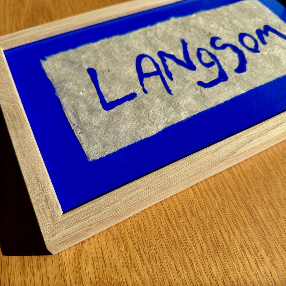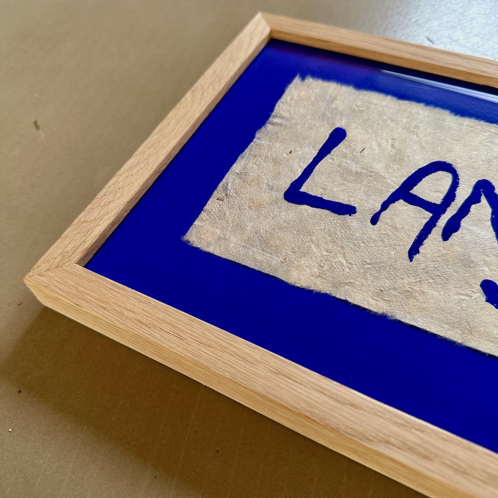 Papiret er klæbet op på en håndmalet ultramarine-blå baggrund og herefter indrammet i massiv egetræ og art-glas. Art-glas giver minimal reflektion, og man kan blive helt i tvivl, om der overhovedet er glas på.