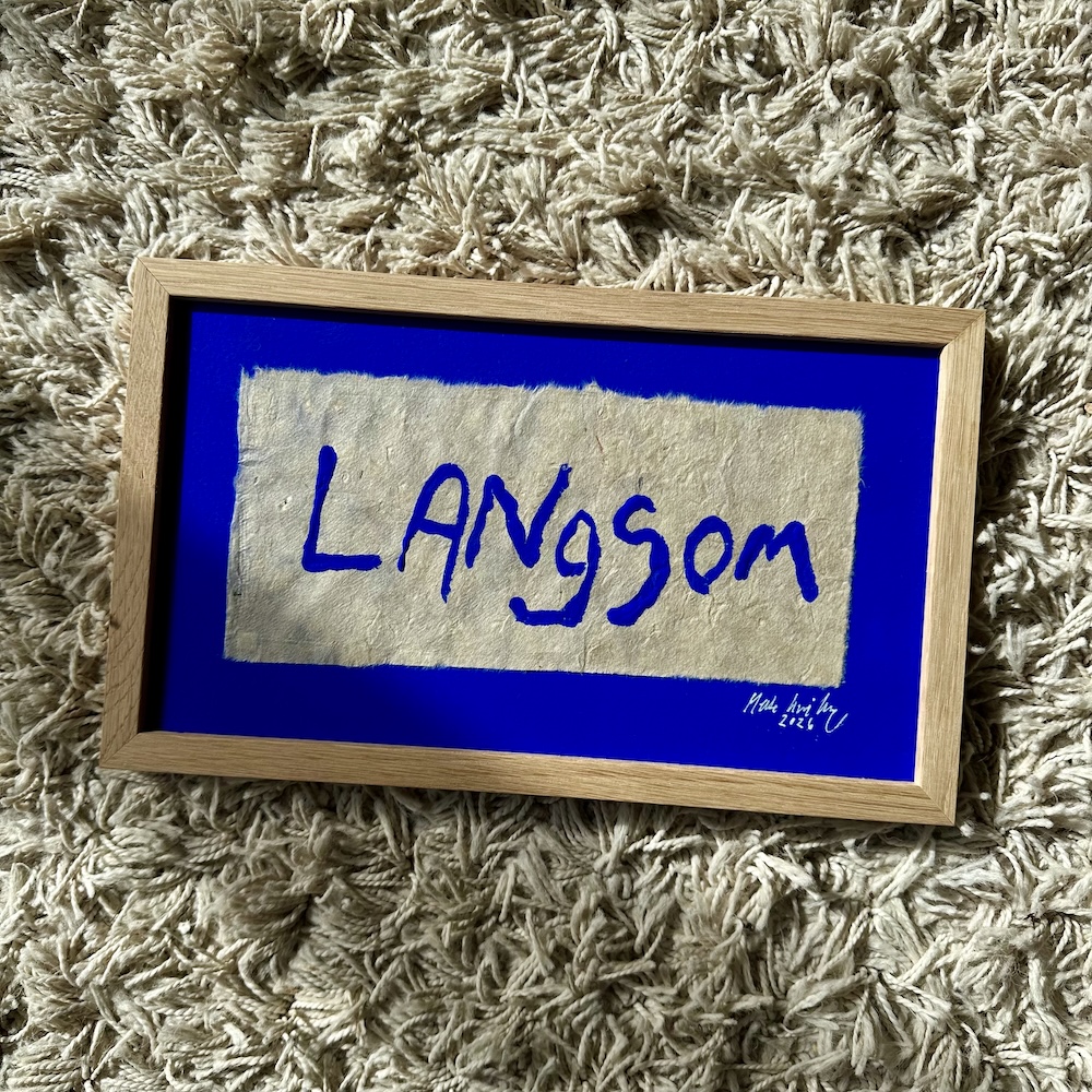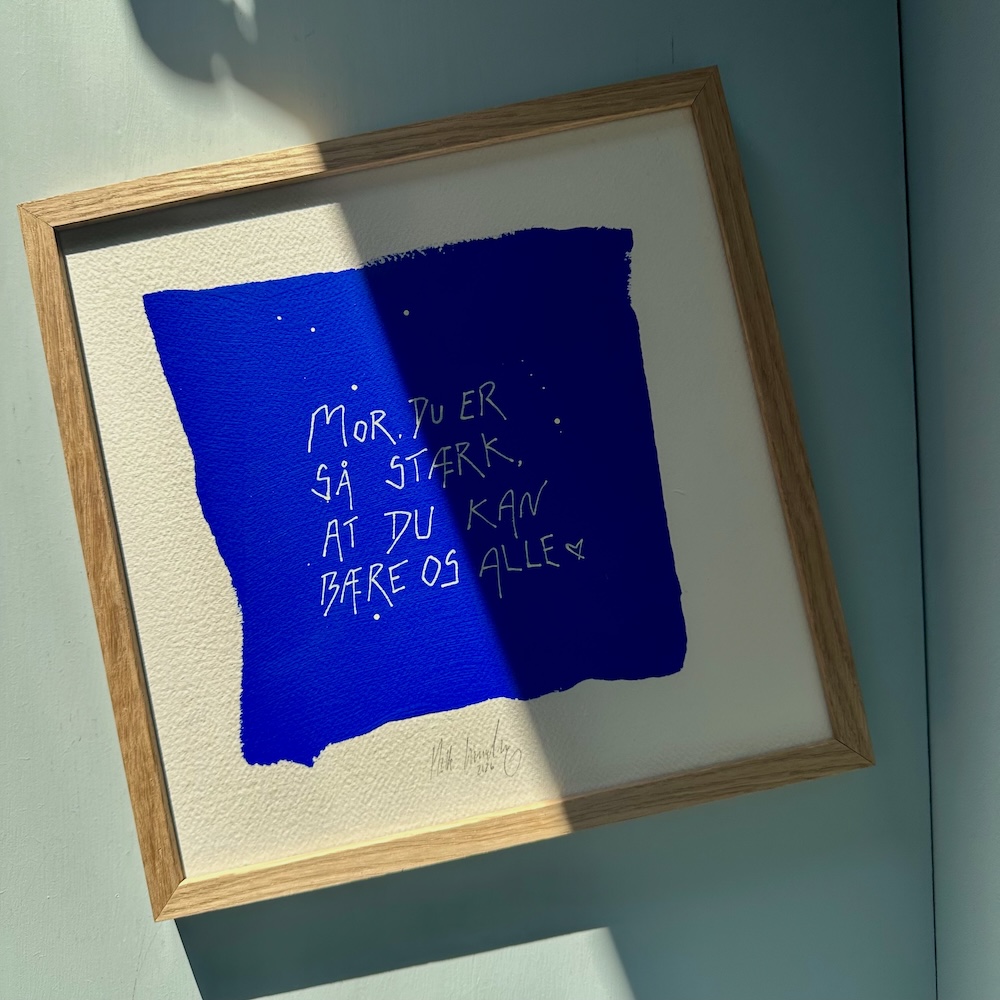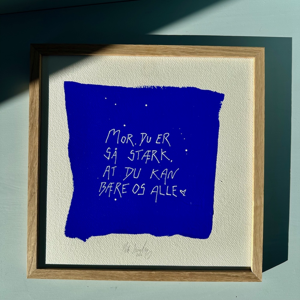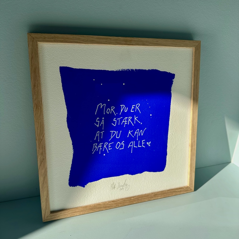 Smukke ord på en smuk ultramarine blå baggrund. Malet på håndlavet papir med struktur og herefter sat i en massiv egetræsramme med art-glas, som lader værket stå helt tydeligt frem uden refleksion.