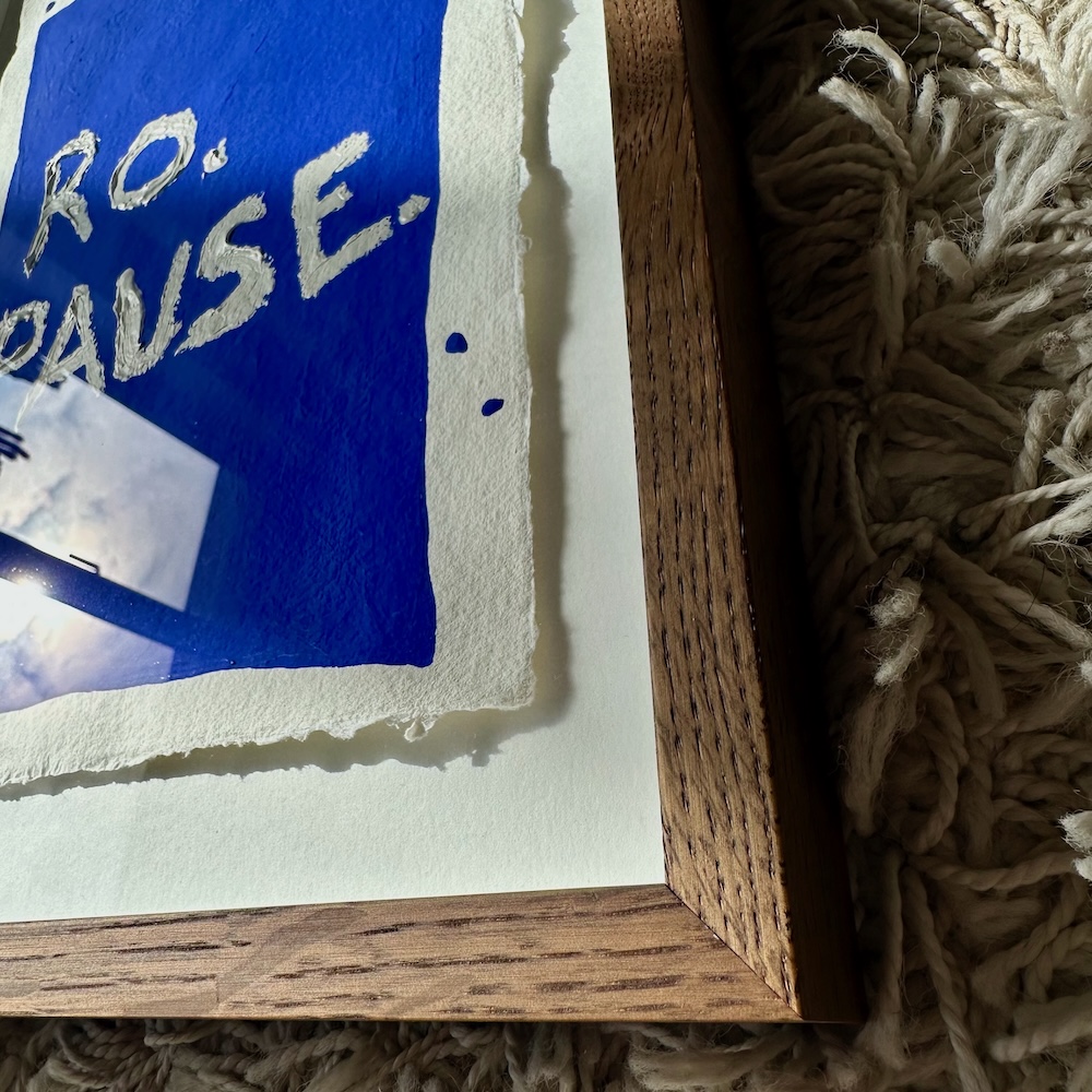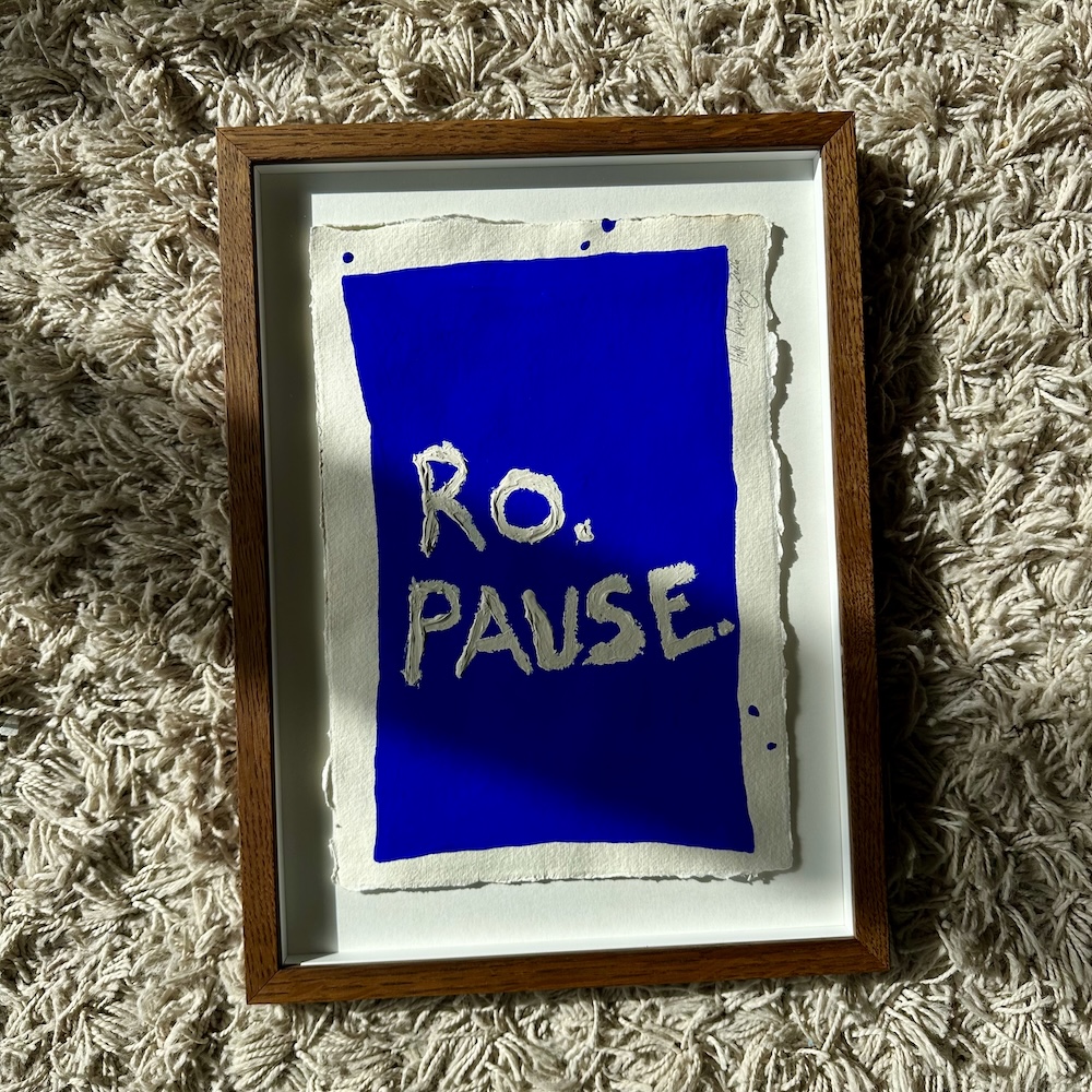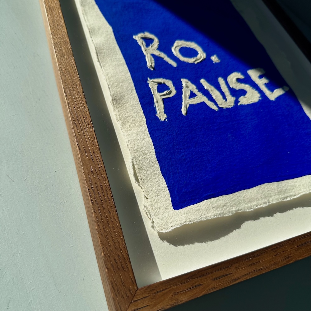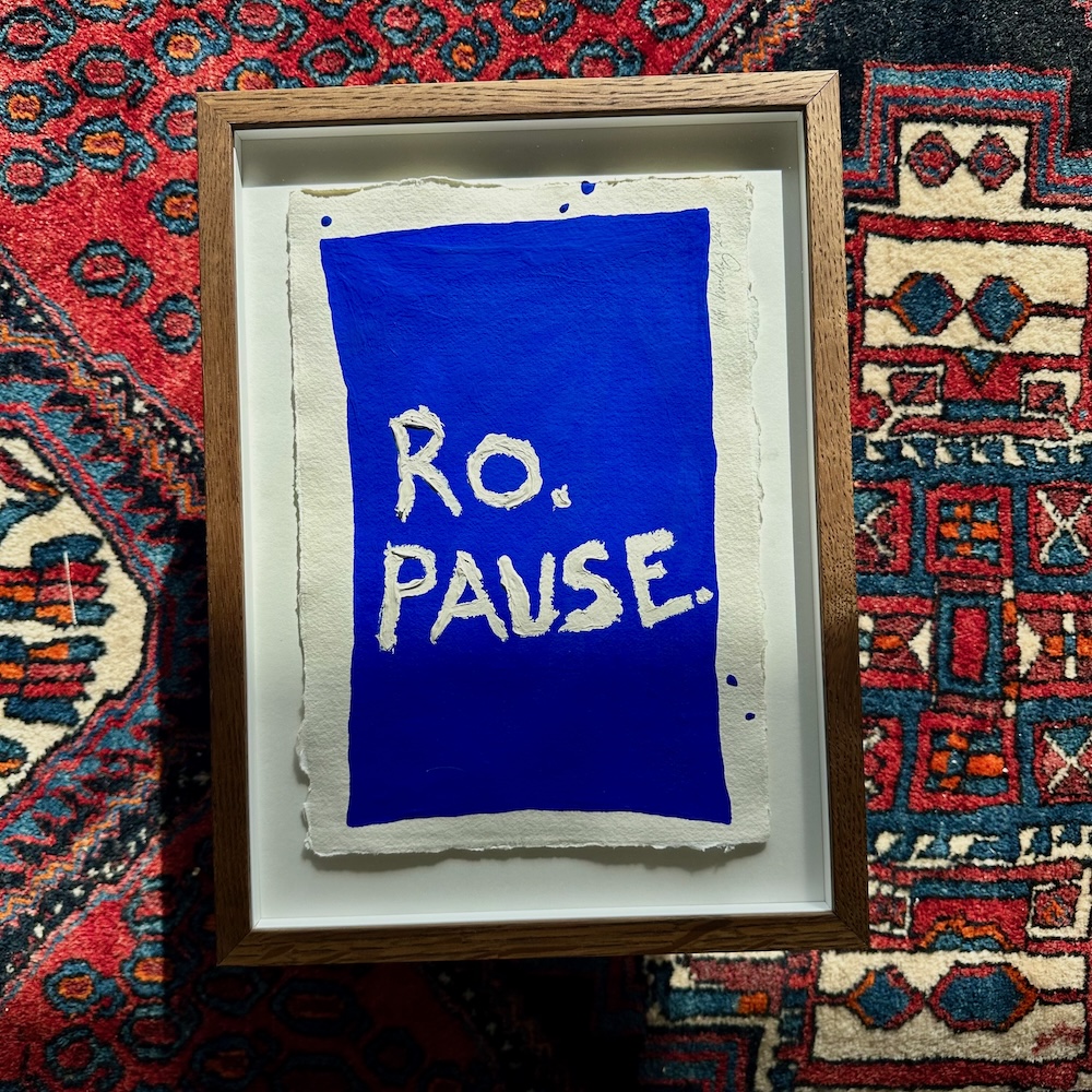 Et lysende og smukt værk malet med ultramarin blå på håndlavet papir med struktur. Sat i en smuk massiv ramme af røget eg. Værket af fra mine serie “Ultramarine”, hvor den smukke blå farve optræder i forskellige skikkelser. Her som baggrund for ordene “Ro. Pause”