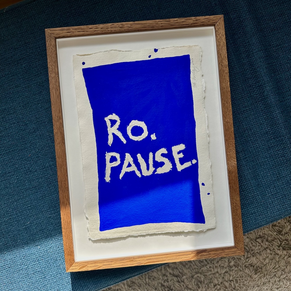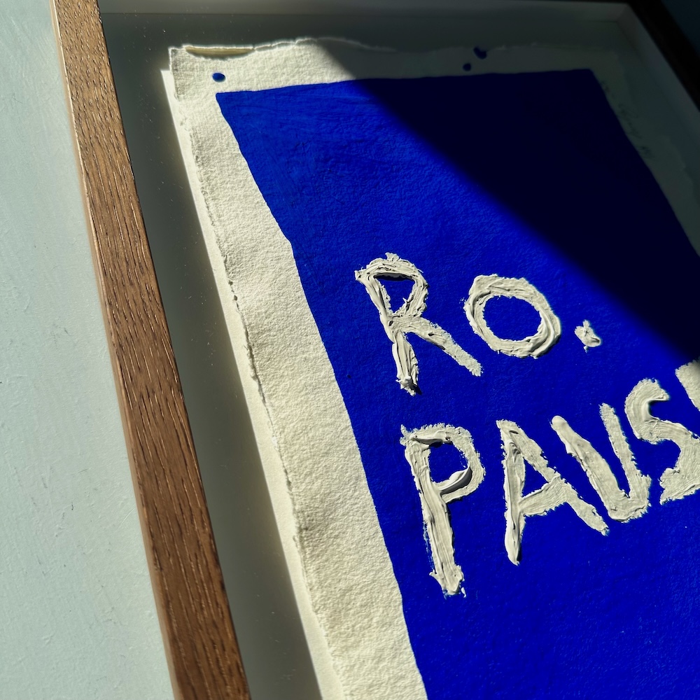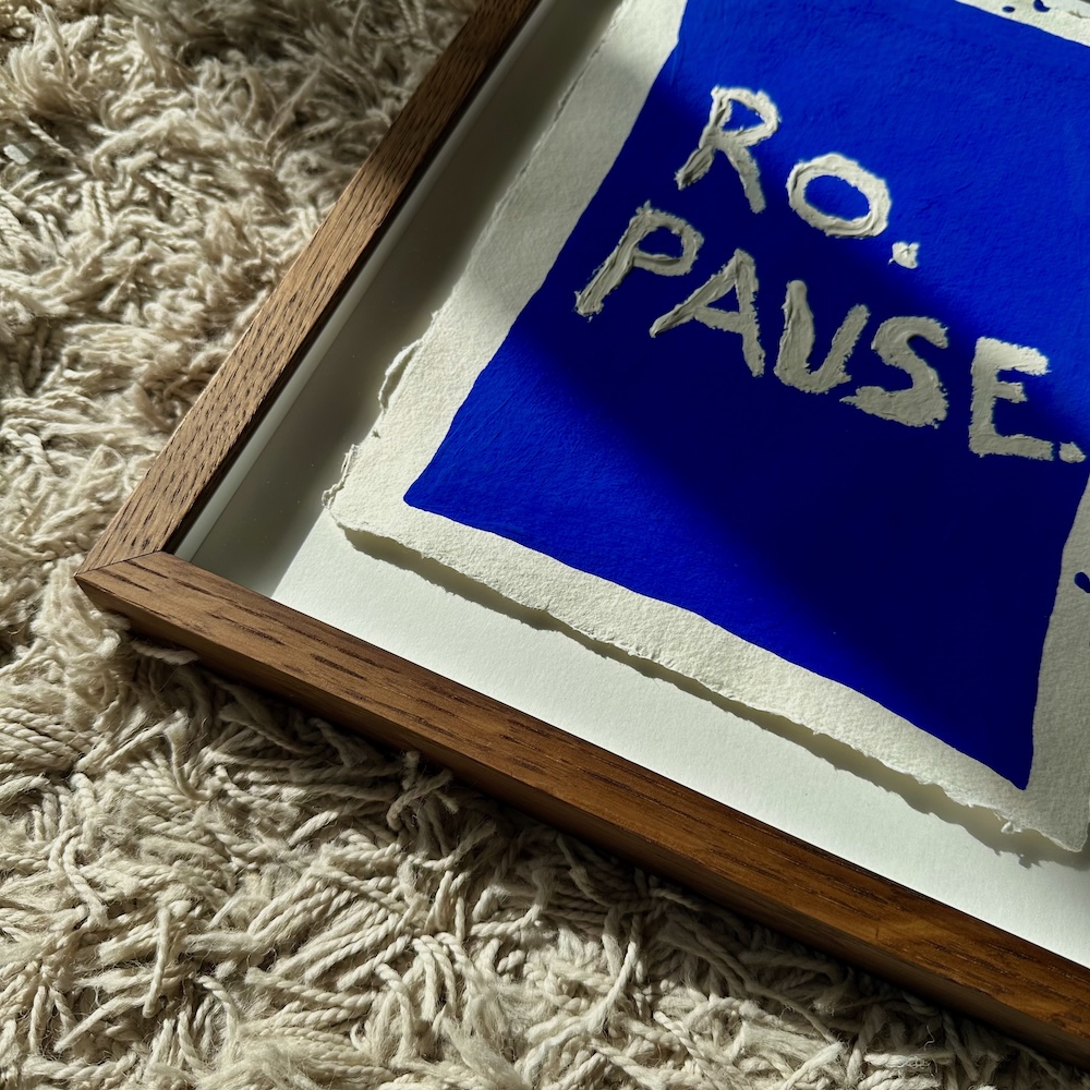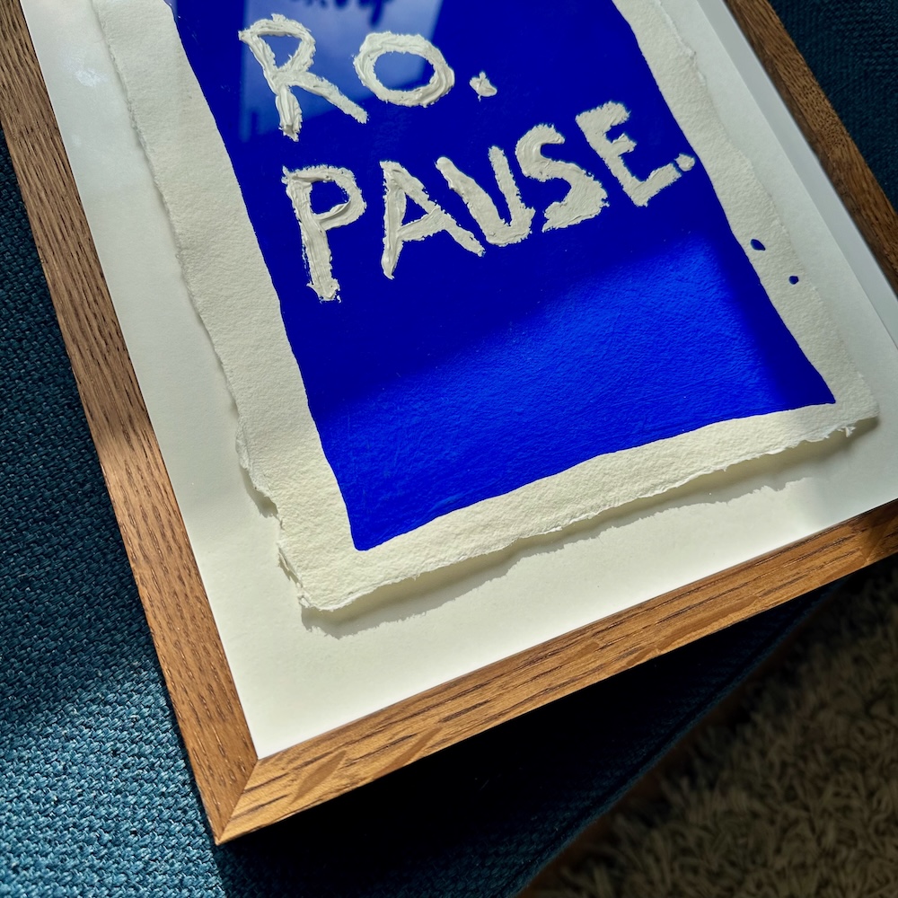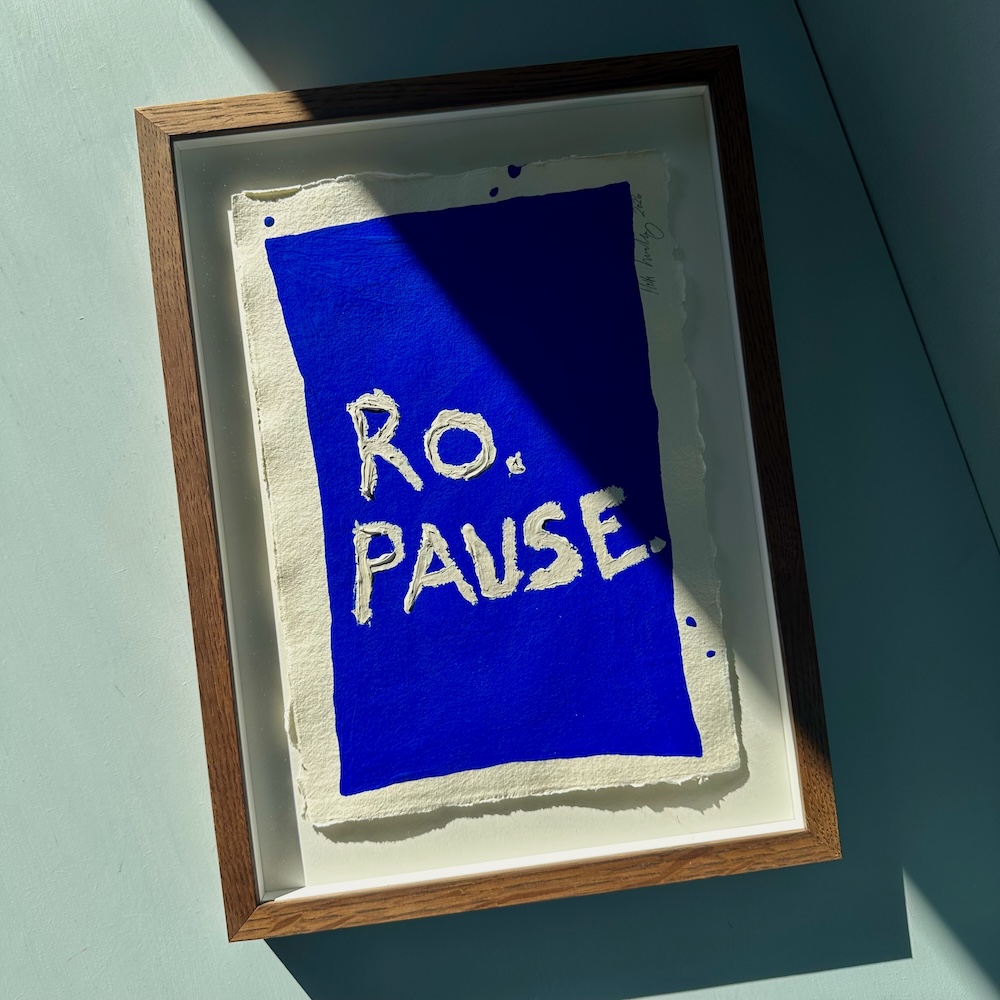 Et lysende og smukt værk malet med ultramarin blå på håndlavet papir med struktur. Sat i en smuk massiv ramme af røget eg. Værket af fra mine serie “Ultramarine”, hvor den smukke blå farve optræder i forskellige skikkelser. Her som baggrund for ordene “Ro. Pause”