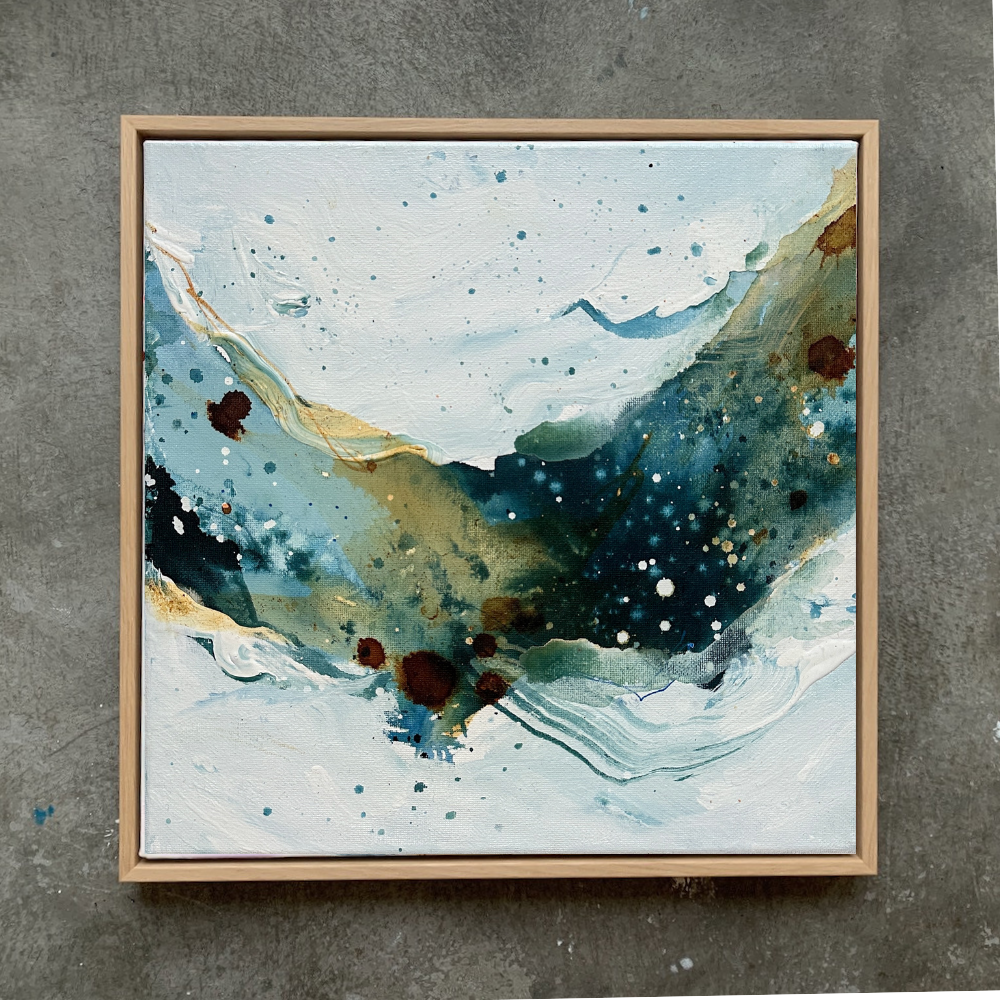 Både min maleproces og det færdige udtryk i dette værk repræsenterer mit ønske om mere ro og blødhed i min hverdag, i min kunst og i mit liv helt generelt. Og det håber jeg, at du kan mærke, når du går på opdagelse i de transparente flader og lag, som giver dette maleri karakter.