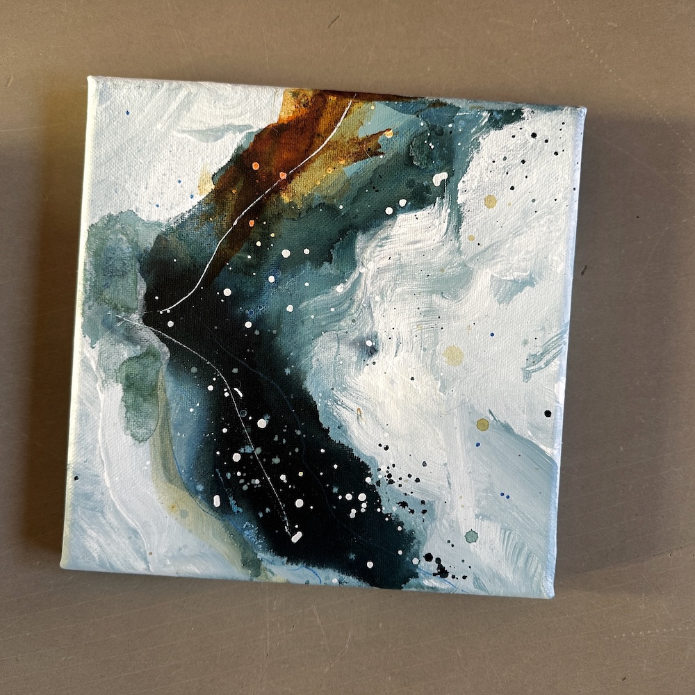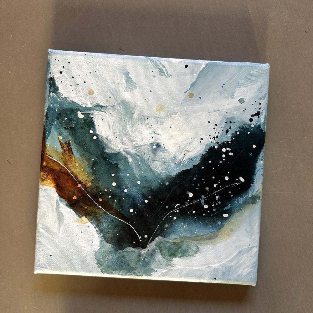 Både min maleproces og det færdige udtryk i dette værk repræsenterer mit ønske om mere ro og blødhed i min hverdag, i min kunst og i mit liv helt generelt. Og det håber jeg, at du kan mærke, når du går på opdagelse i de transparente flader og lag, som giver dette maleri karakter.