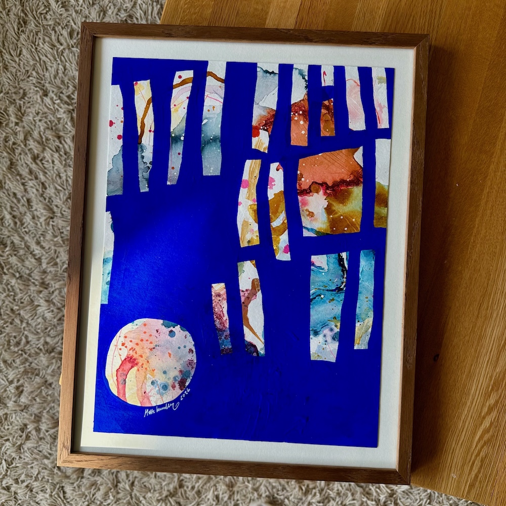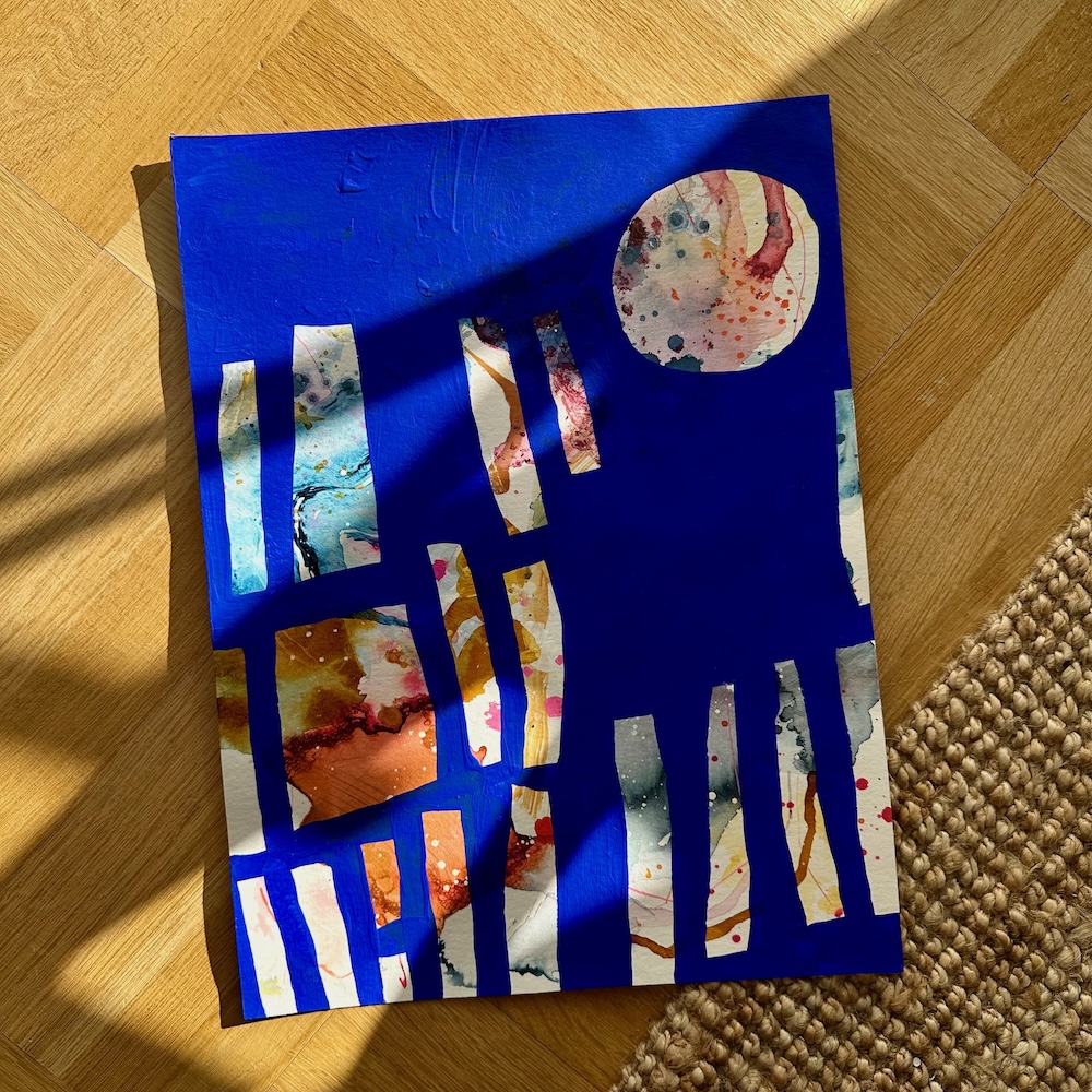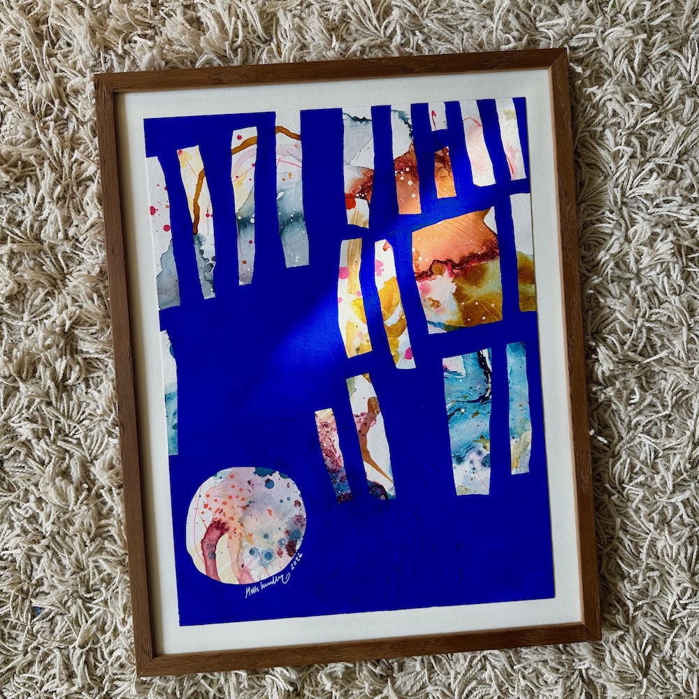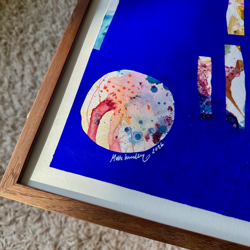 Værket her er lidt en outsider i min serie af ultramarine-blå værker, fordi det under den blå farve er beriget med masser af andre smukke farver. Under den dybe blå overflade gemmer der sig et liv af farver og detaljer, som “rammes” ind på smukkeste vis af den ultramarin blå akrylmaling.