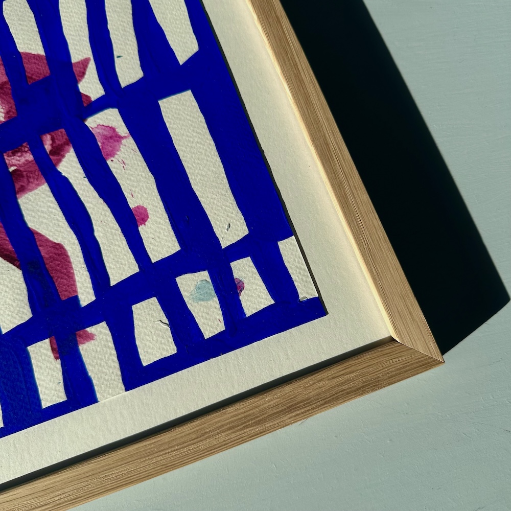 Det særlige ved dette værk er, at der bag det blå lag af maling udspiller sig en fortælling af lette penselstrøg og markeringer i bordeaux, sart blå og grøn. Som om, at noget sker derinde bag det ultramarin blå “gitter”, som du kan gå på opdagelse i.