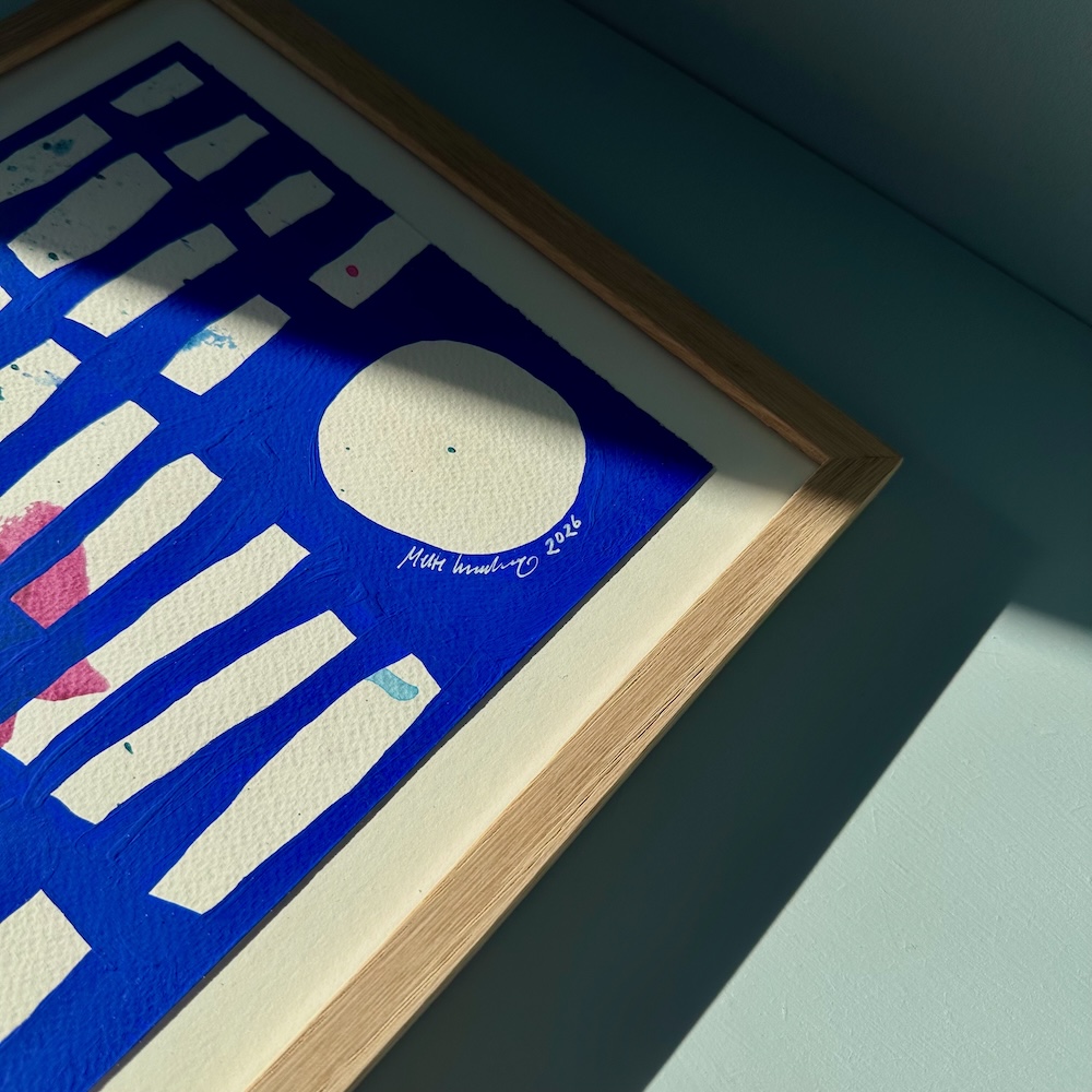 Originalt værk malet på akvarel papir med let rillet struktur i overfladen. Værket er fra min serie “Ultramarine” malet med den smukke ultramarine blå farve, som lyser så smukt op i godt selskab – særligt med solen.