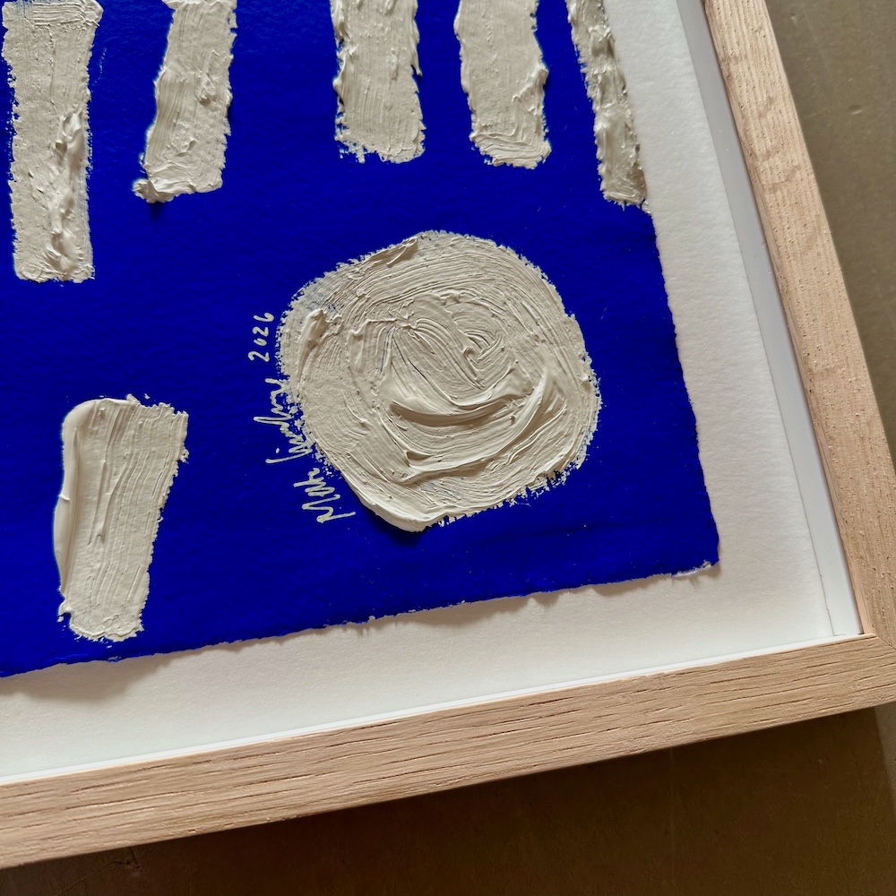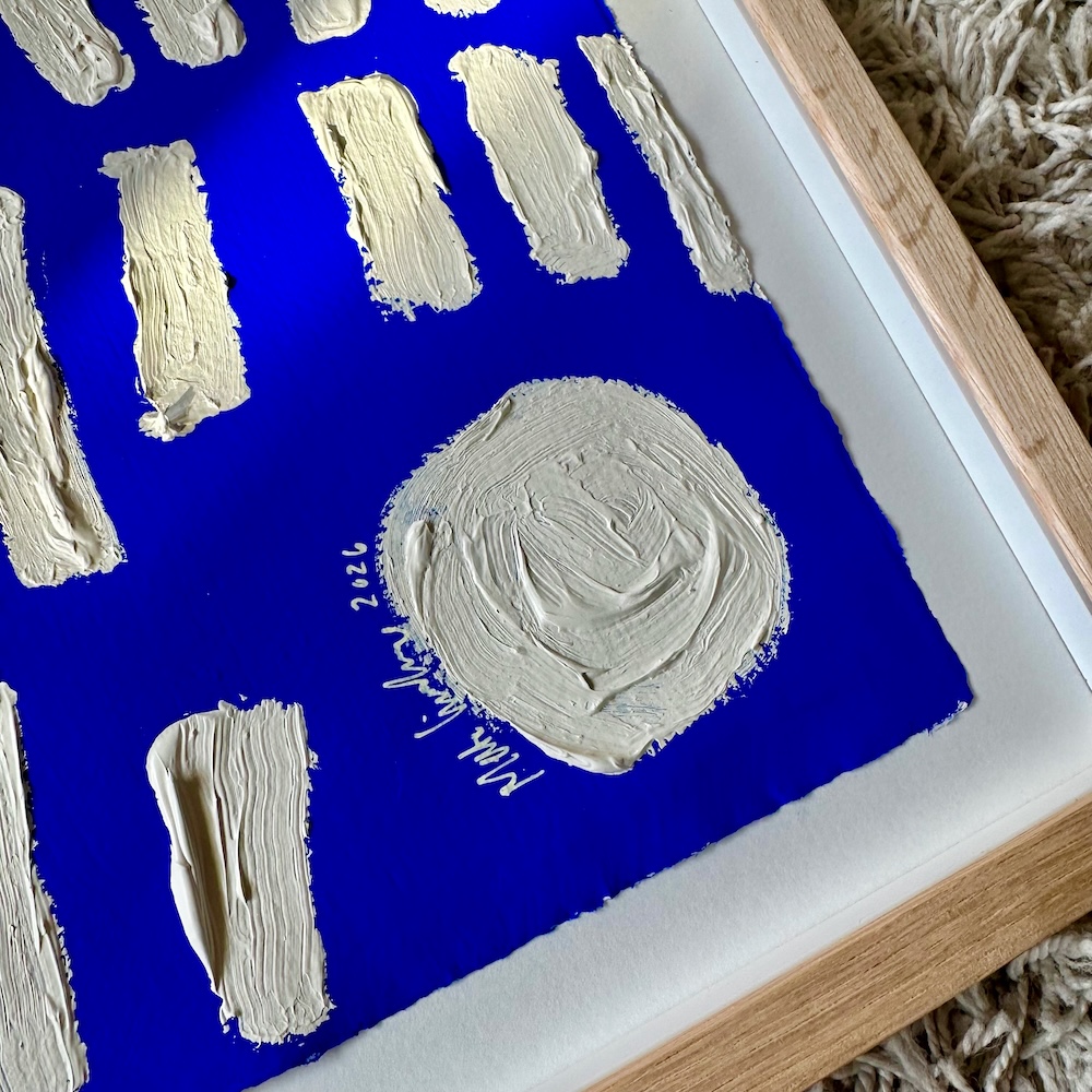 Den tykke maling har en helt særlig tekstur og tyngde, som ligger meget smukt oven på den lysende blå baggrund. Og lader du en solstråle falde på værket, vil du opleve, hvordan den ultramarine blå farve lyser ekstra op.