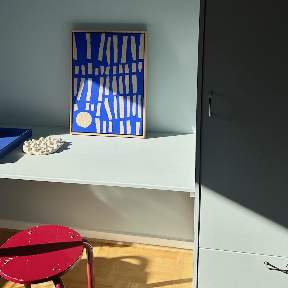 Værket er malet med sirlig hånd, og selvom det har et mere stringent og grafisk udtryk end mine abstrakte værker, så vil du alligevel ane skævhederne og det håndmalede, når du går helt tæt på. For mig er det det skæve og det uperfekte, der gør mine værker særlige. At intet er pænt, symmetrisk. Eller kedeligt. Men skævt og karakterfyldt.